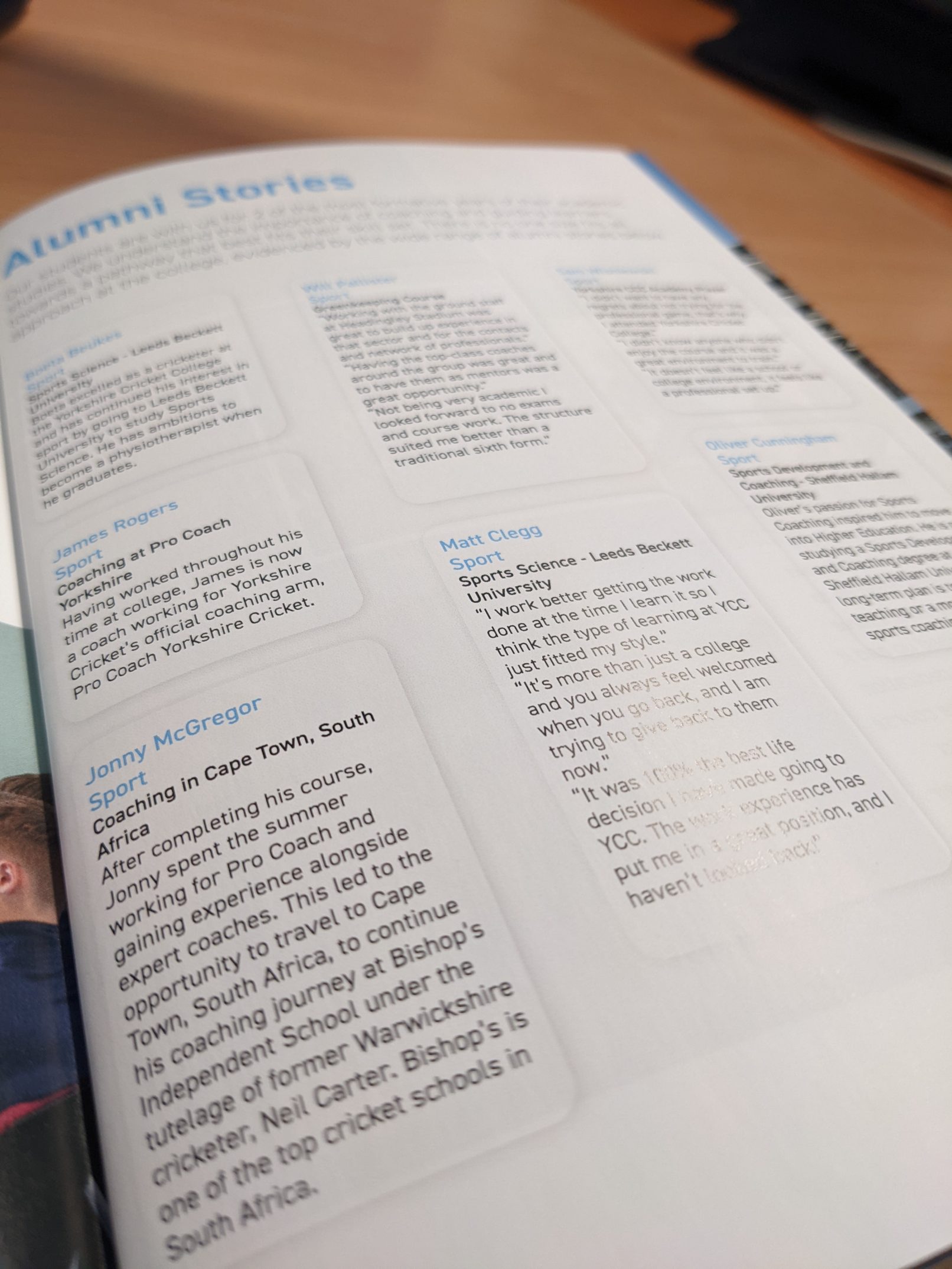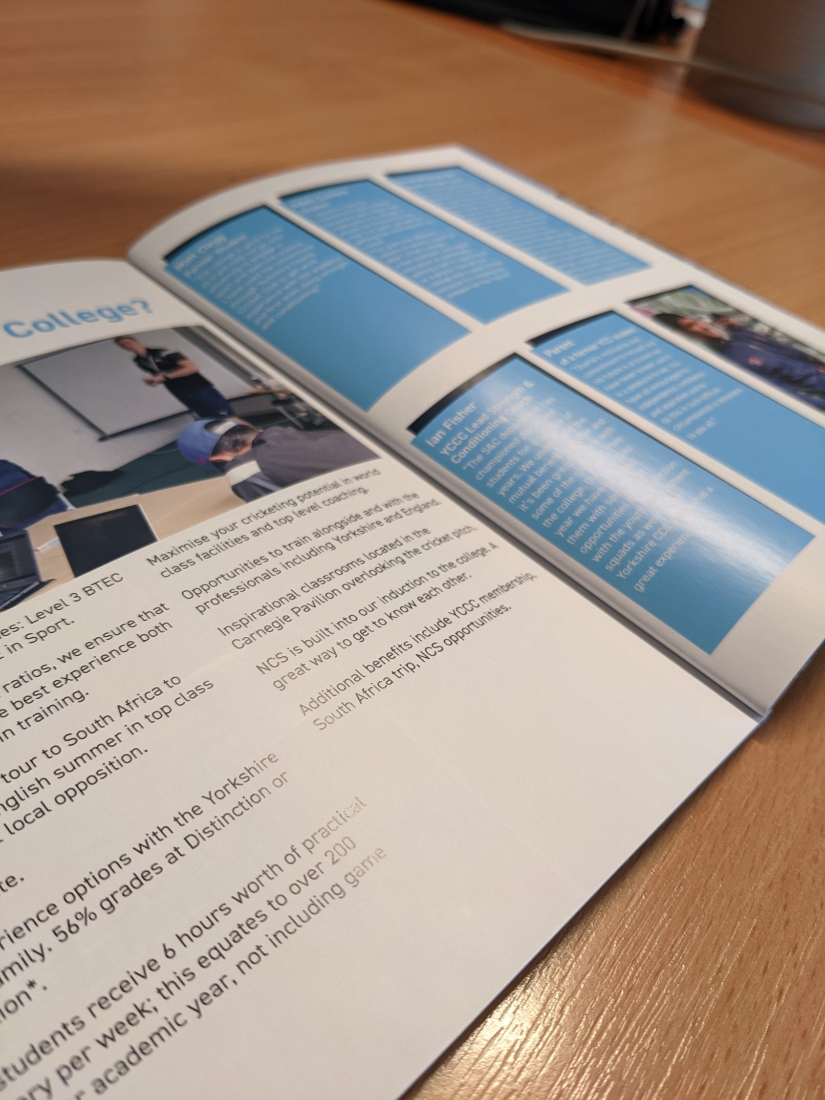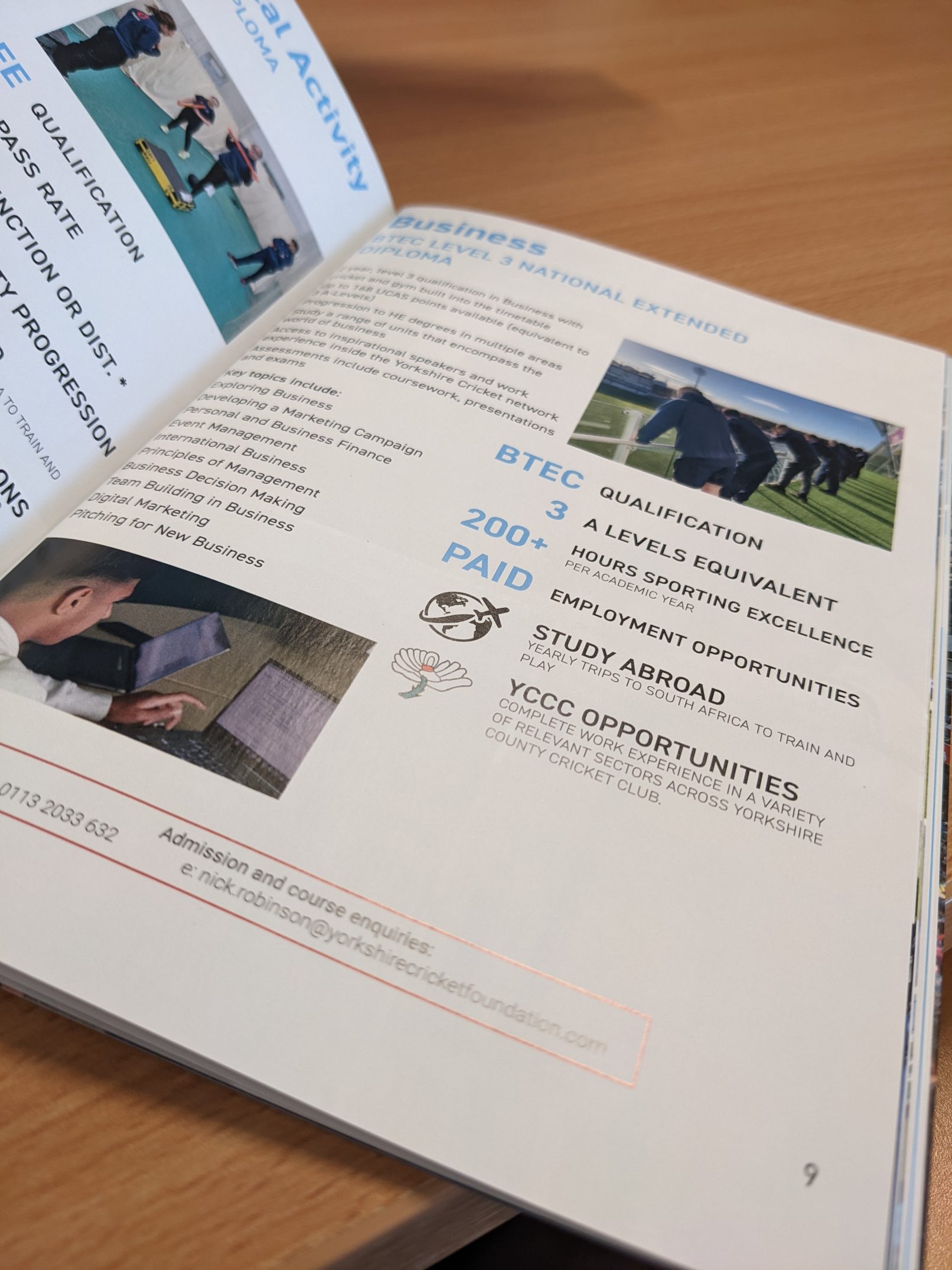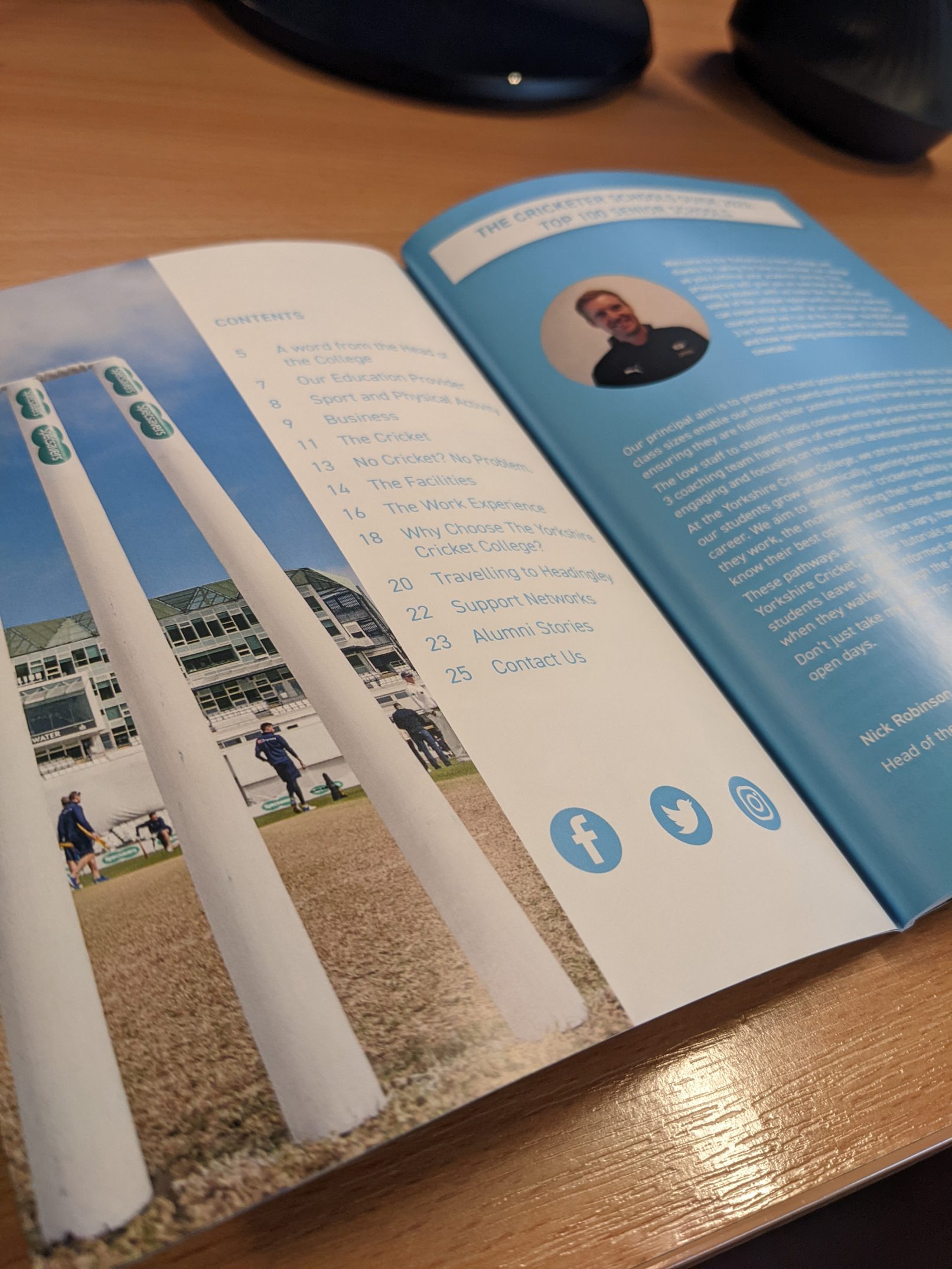 I designed a 28 page printed prospectus to show off the Yorkshire Cricket College. One of the main challenges was the low-resolution photos that the College used to show off their work, due to teaching staff having different priorities in the classroom. In anticipation of this, I spent several months prior attending College events with my camera to capture print-quality photography that showed off some of the amazing opportunities that students can expect on the course.